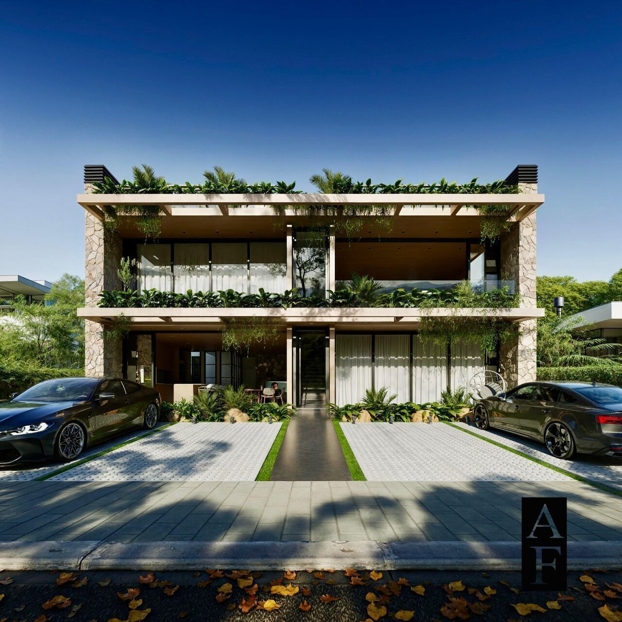 No exterior: Vaga de garagem na frente, e andar superior amplo rooftop.