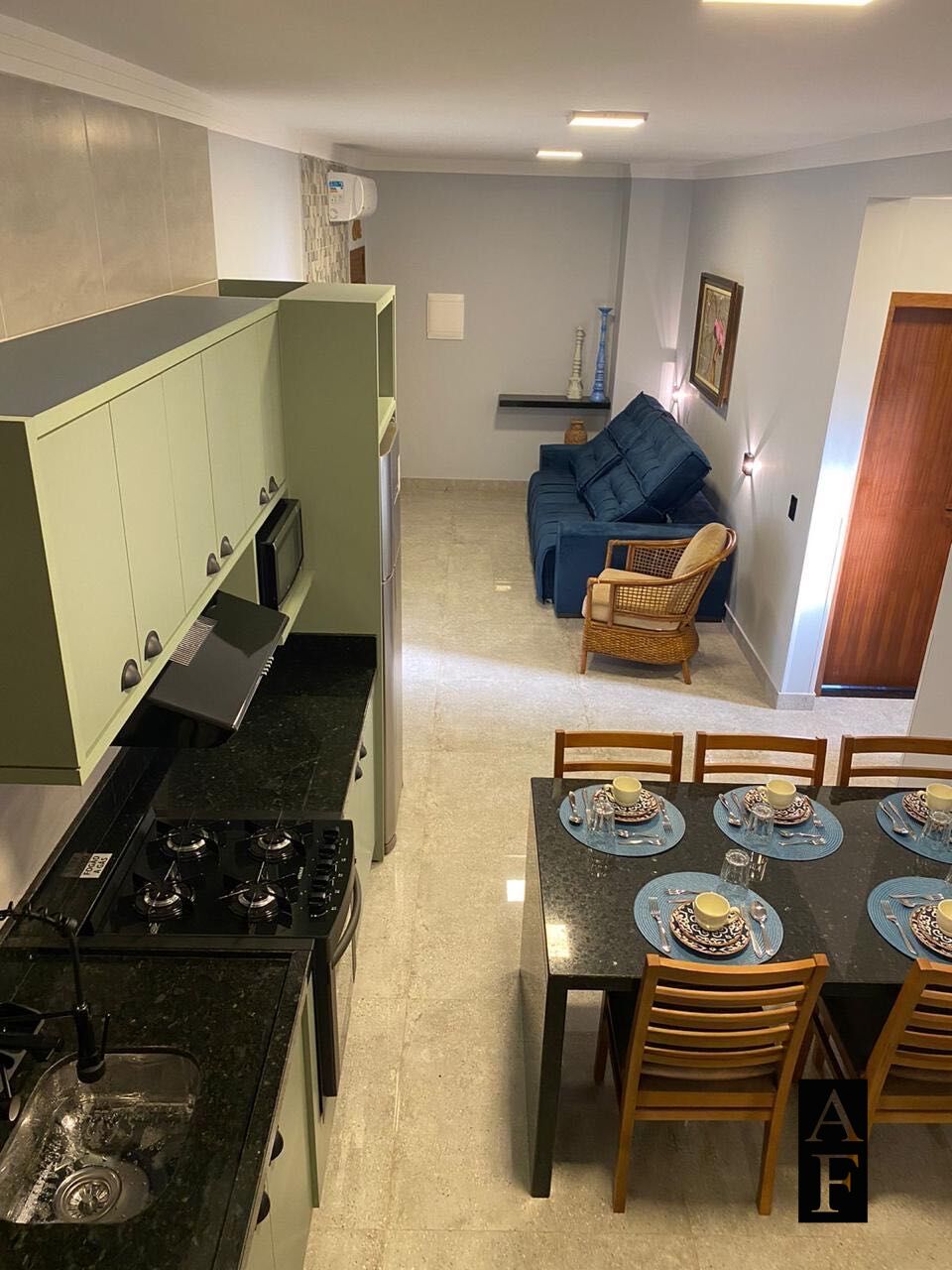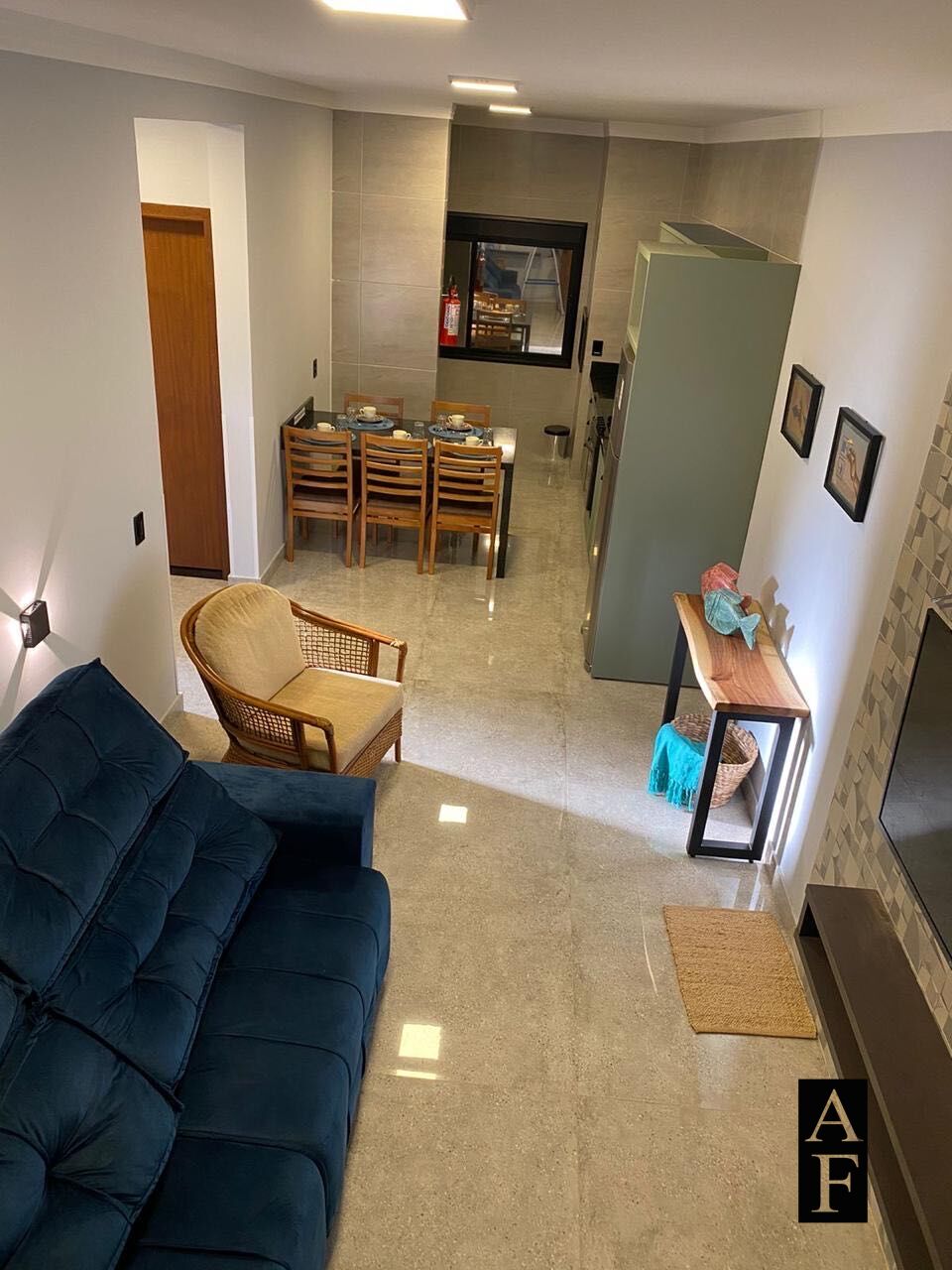 Com dois quartos, um banheiro, sala e cozinha integradas, lavanderia e churrasqueira;