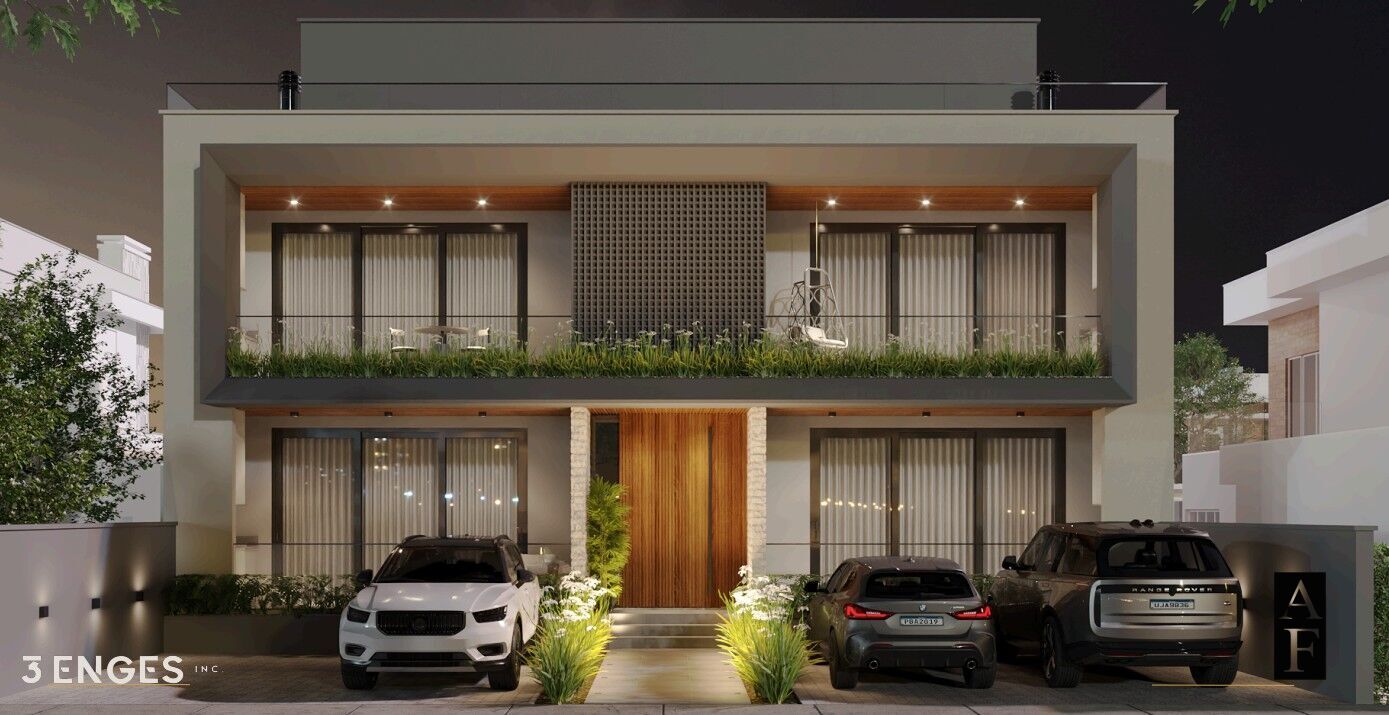 •Revestimentos em muxarabi, pedra natural, madeira, amplas esquadrias na cor preta e pintura