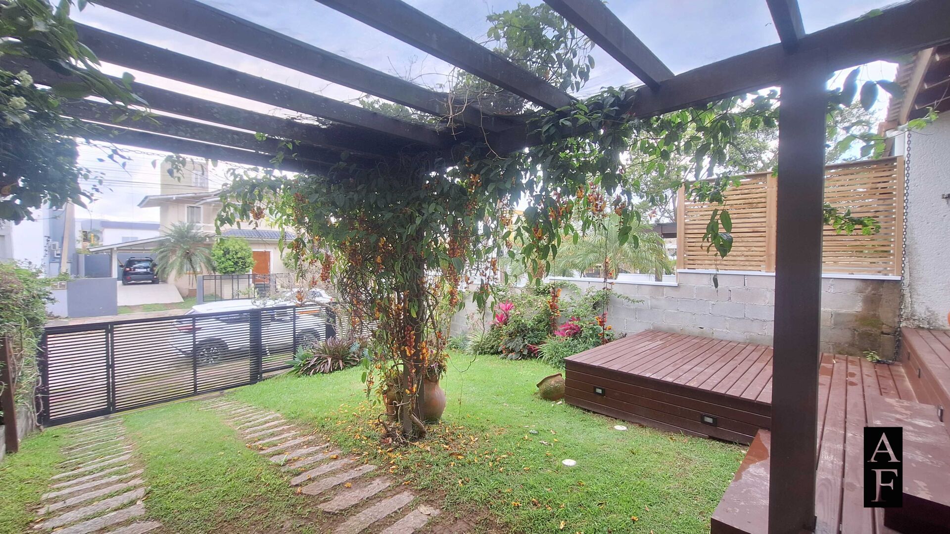 Parte externa: Amplo jardim, vaga para dois carros sendo uma delas coberta, deck em dois niveis e varanda. No fundo pátio.