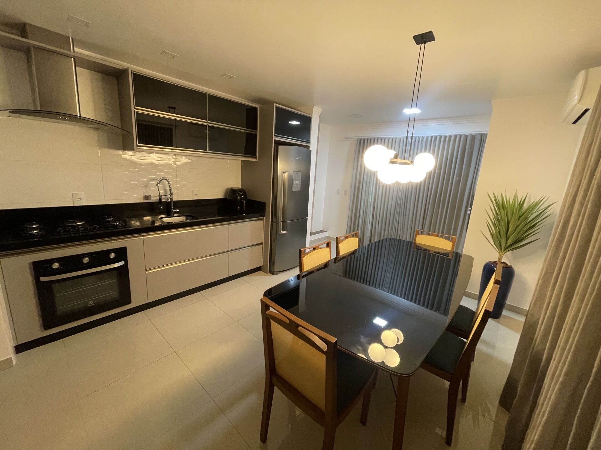 No pavimento superior, uma suíte e um dormitório com varanda e móveis planejados e um banheiro social.