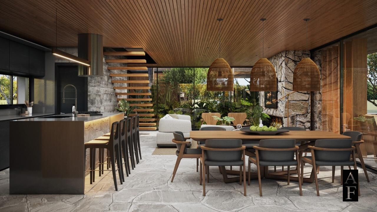 A área social é complementada por lavabo, banheiro externo, depósito, lavanderia e uma cozinha gourmet com ilha central e despensa.
