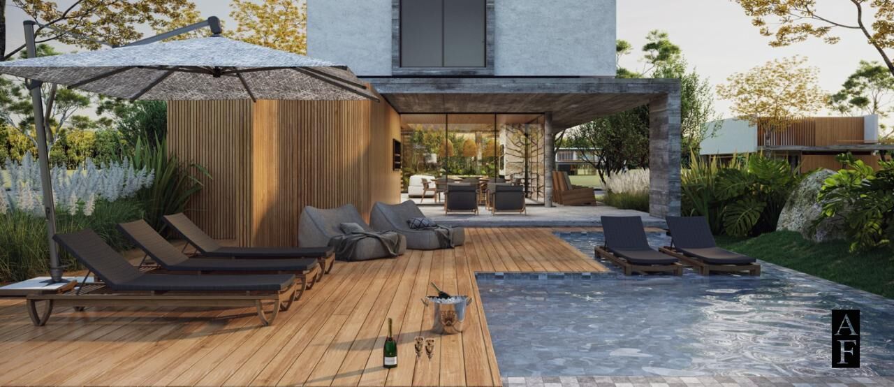 No térreo, a área social se destaca pelas amplas esquadrias de vidro deslizantes, que se embutem na alvenaria e permitem total integração entre estar, jantar e área externa. O destaque é a piscina com diferentes profundidades, incluindo área rasa para crianças, espaço para espreguiçadeiras, área profunda, envolta por paisagismo que garante privacidade e beleza.
