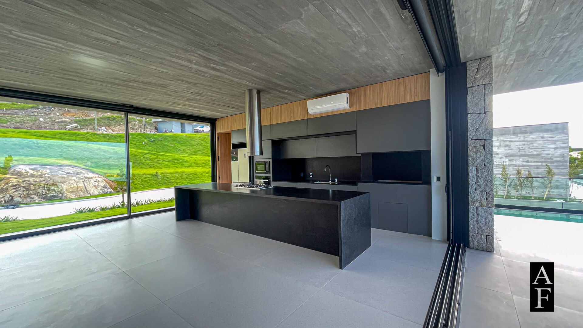 Pavimento térreo, Espaço gourmet, jantar e living com lareira voltados para a vista do mar, com integração total com a varanda. Facilidade de acesso pela garagem e para a suíte térrea.