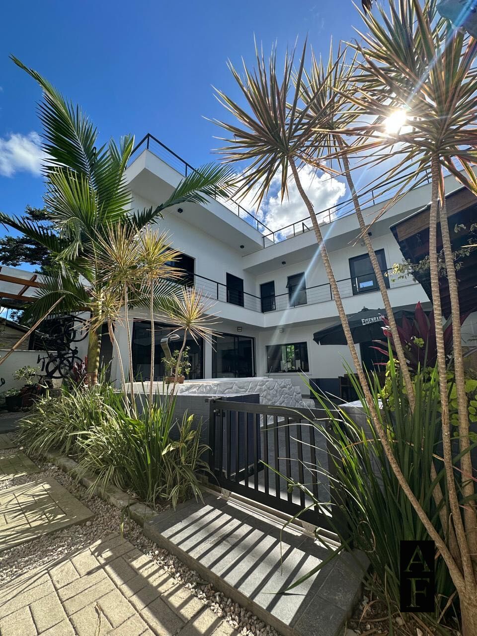 Pátio frontal com 4 vagas de garagem, interfone e paisagismo.
