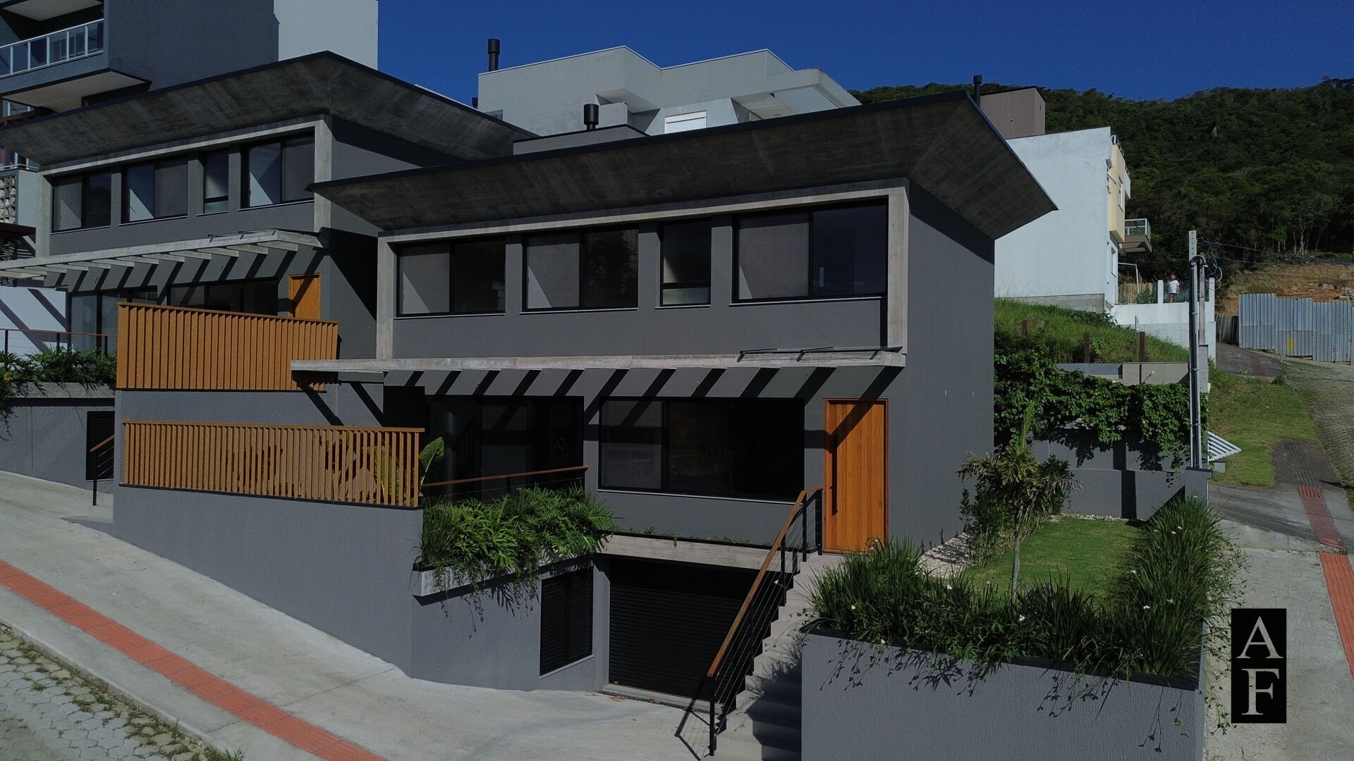 Fachada e interior com mescla em madeira e pedra natural;