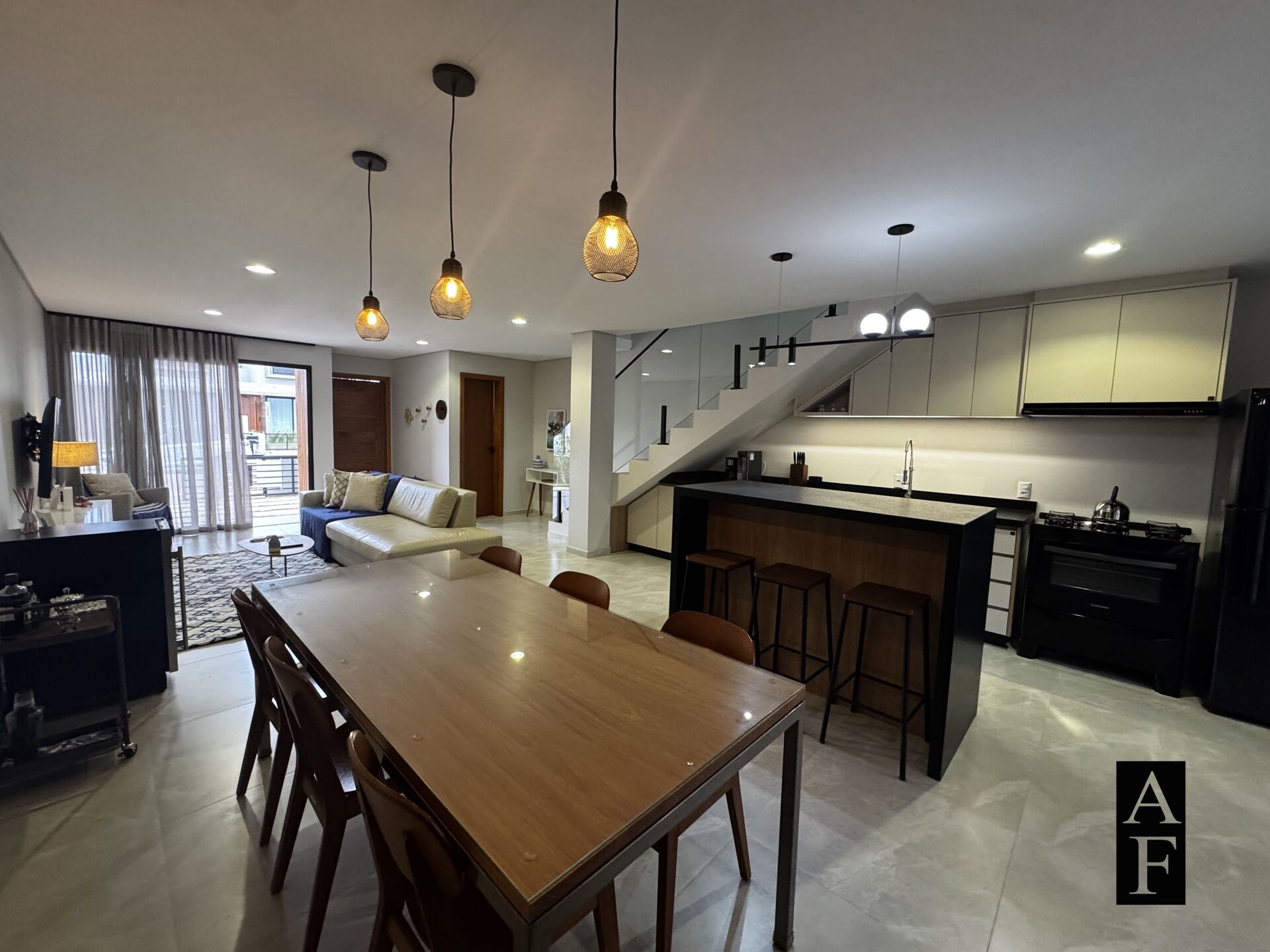 No térreo, o living em conceito aberto integra sala e cozinha, além de lavabo e uma área de serviço separada e fechada, que garante maior organização. Espaço gourmet com churrasqueira à carvão. Já no pavimento superior, estão os 3 dormitórios (sendo 1 suíte), distribuídos para oferecer aconchego e privacidade. Ao todo, são 2 banheiros completos e 1 lavabo.
