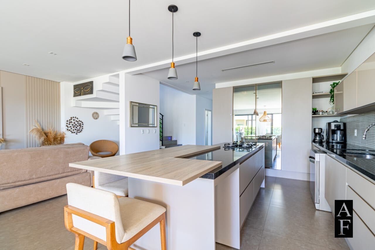 No terréo, cozinha conjugada com a sala de estar, jantar, um banheiro, lavanderia e área com churrasqueira.
