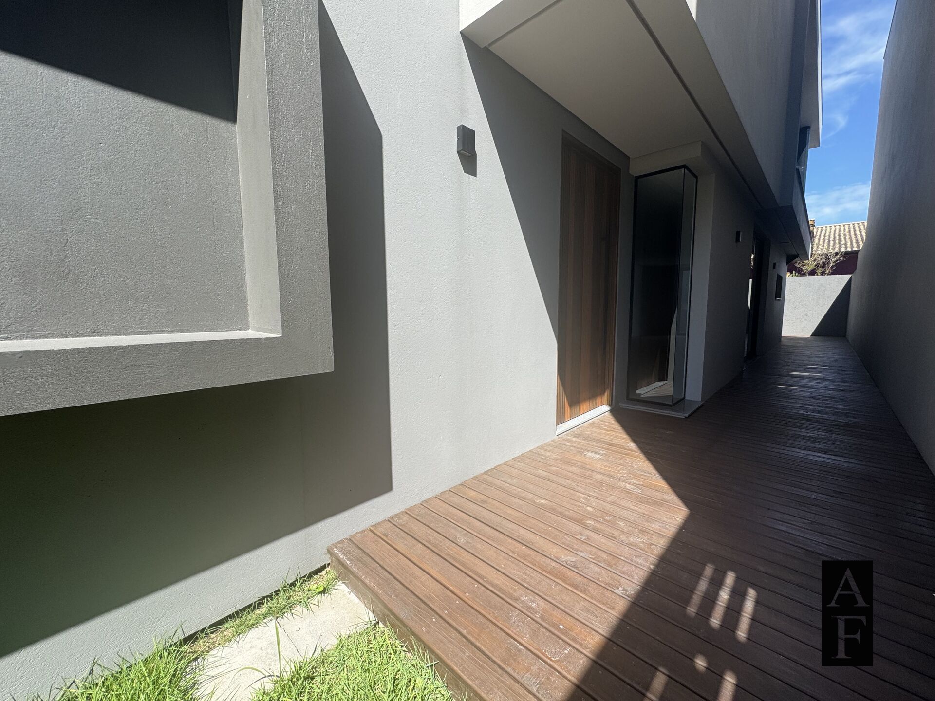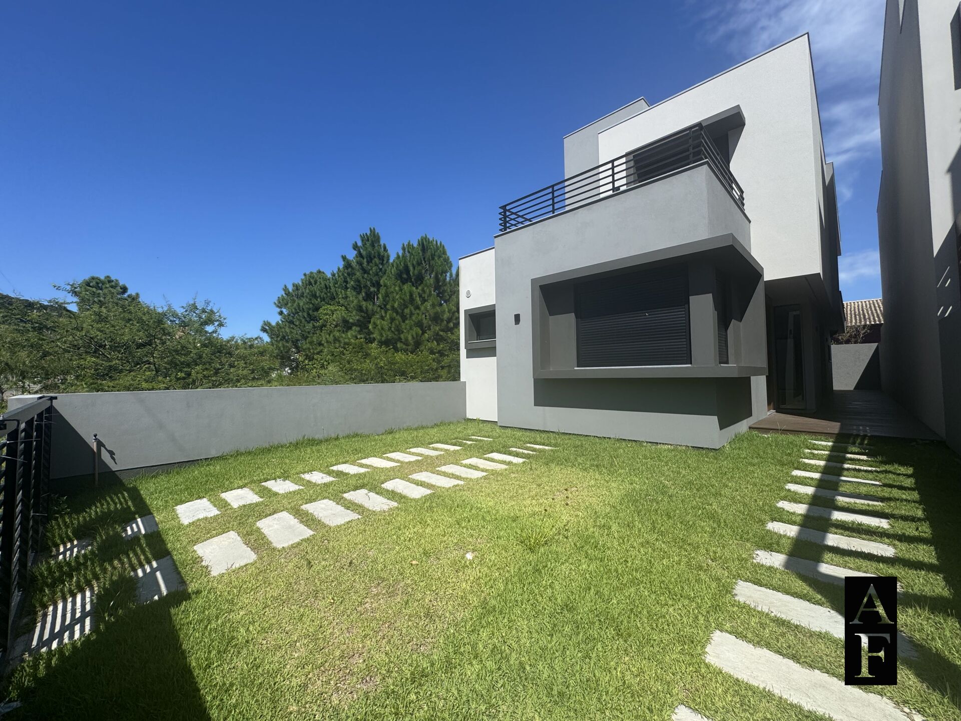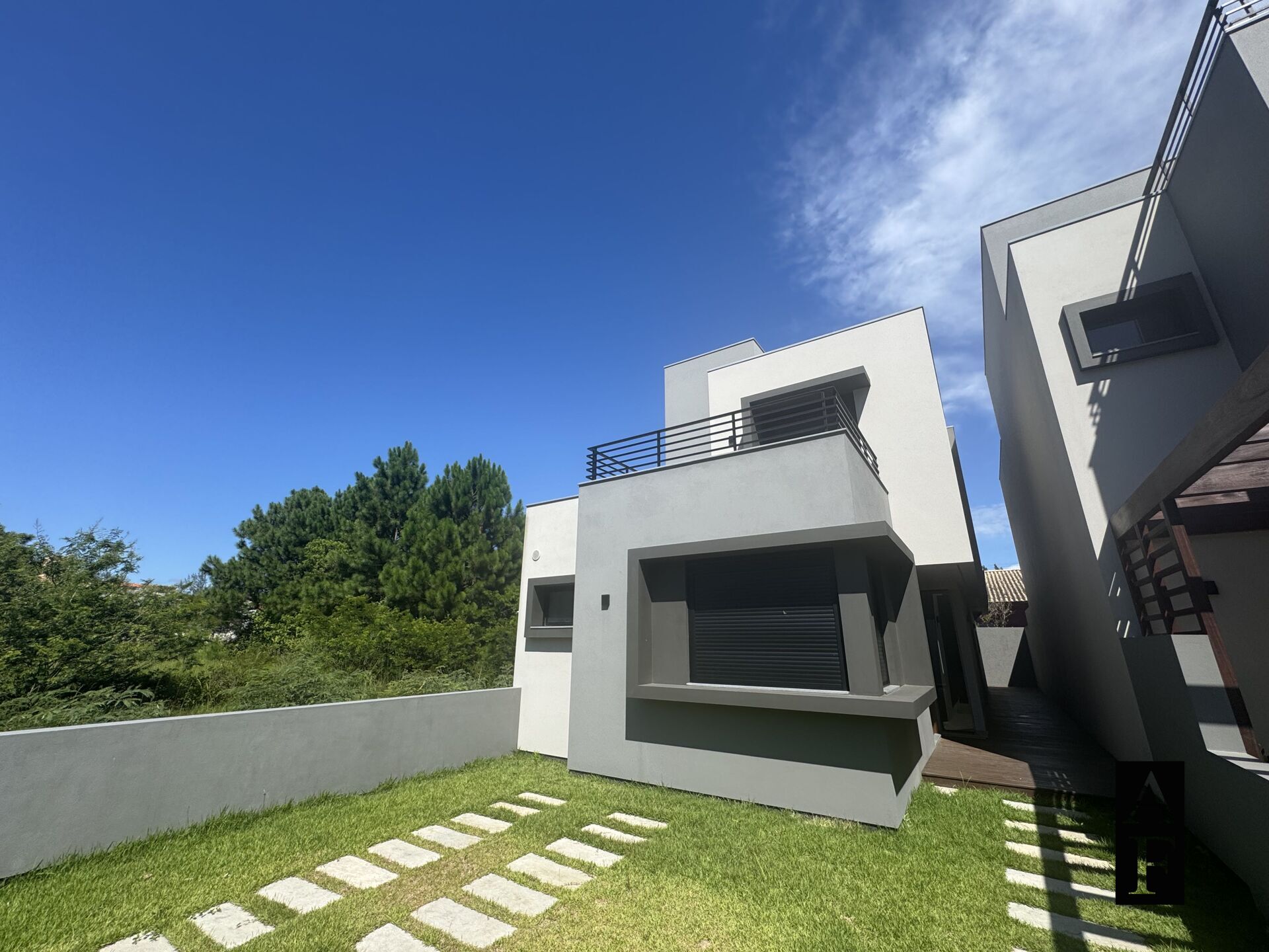 Possui bela fachada moderna, jardim e suave acesso a porta de madeira maciça.