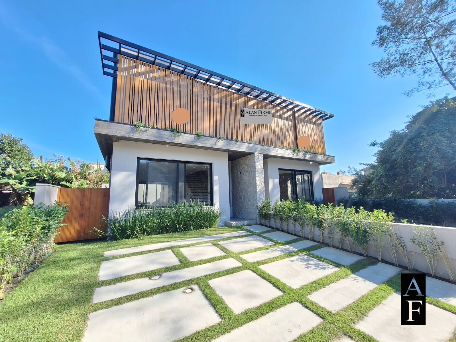 Fachada e interior com mescla em madeira e pedra natural;