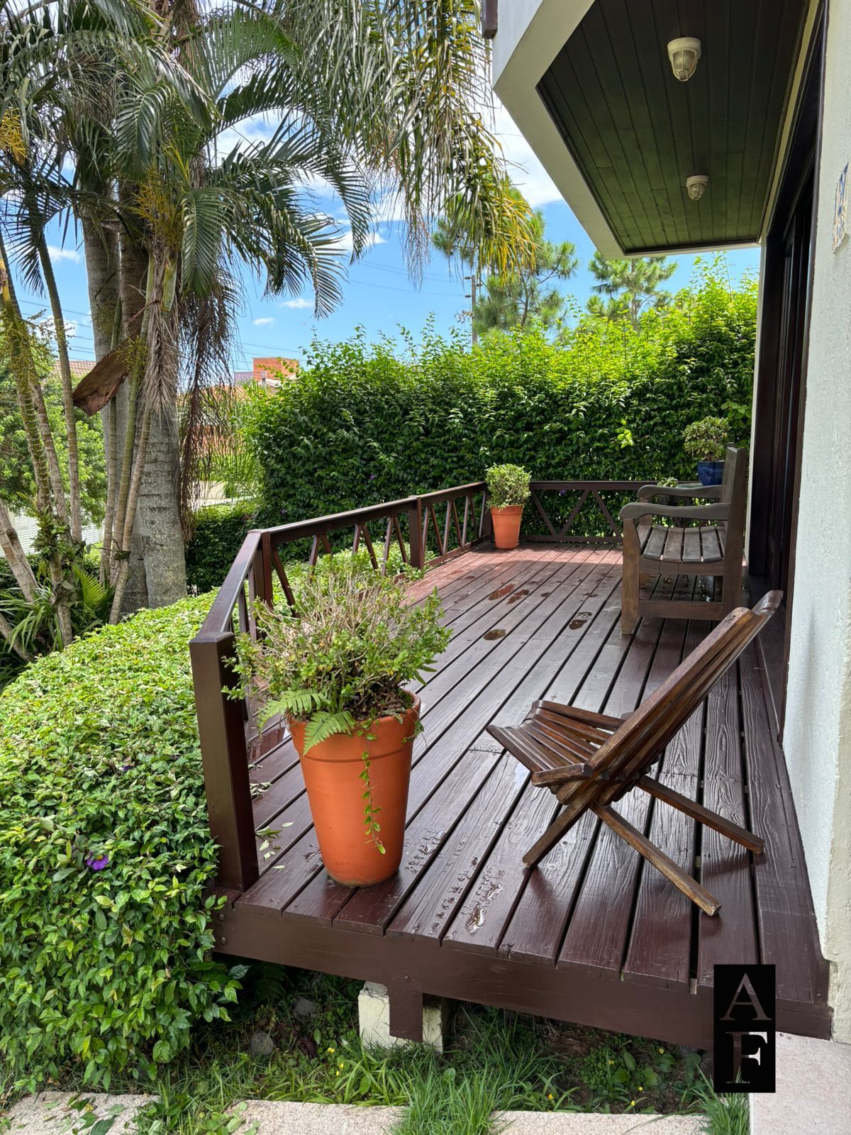 Na parte externa amplo jardim com um deck na parte frente da casa.