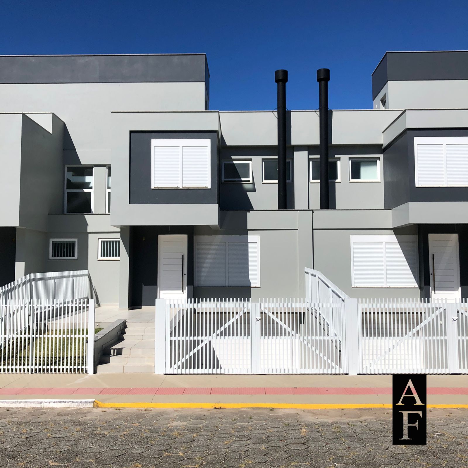 Pavimento térreo: uma sala de estar, uma sala de jantar, uma cozinha integrada com a área de lazer, um lavabo, uma área de serviço e uma escada que dá acesso ao outro pavimento.