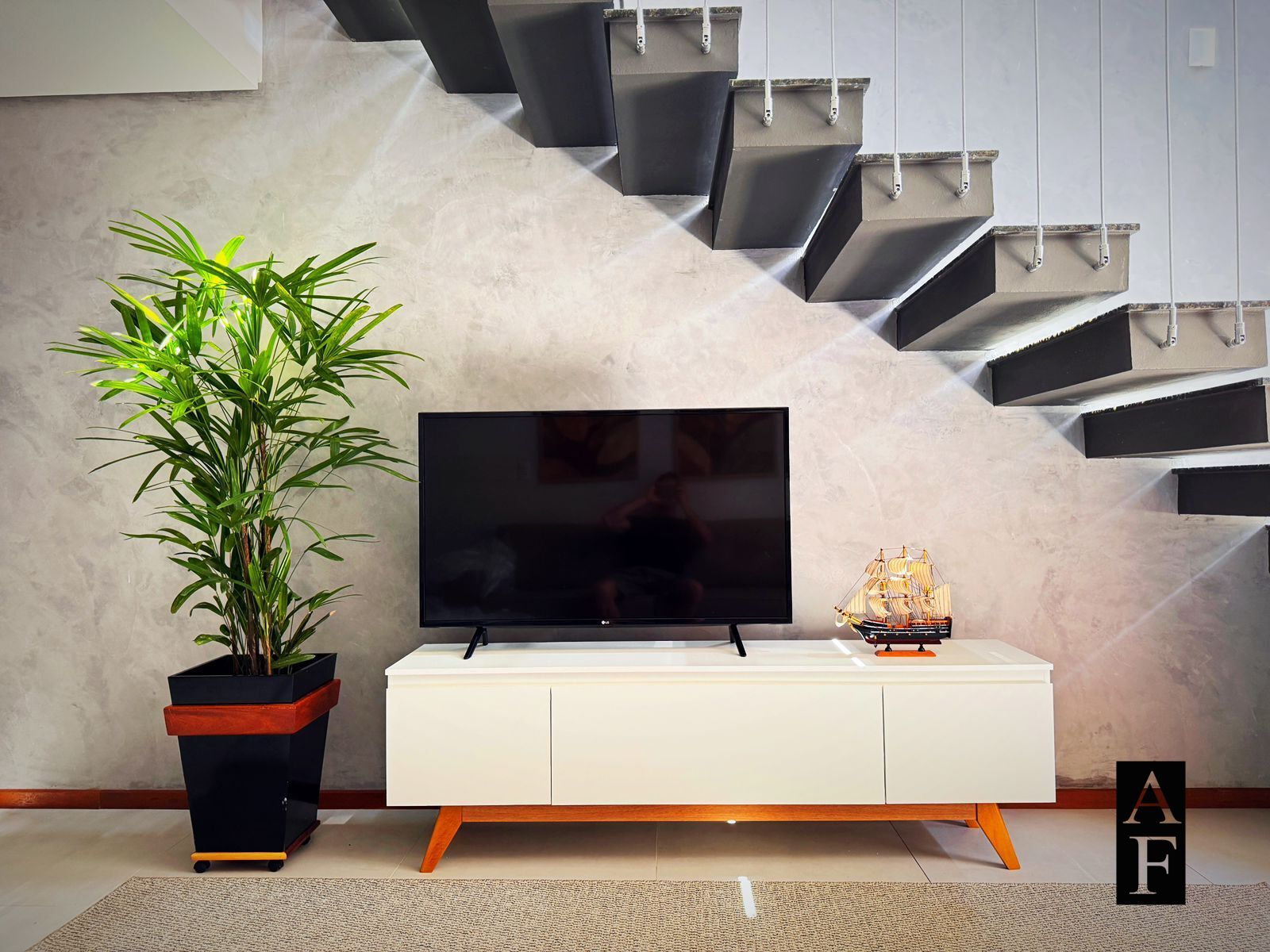 No seu interior no térreo, uma ampla cozinha conjugada com sala de estar e jantar com churrasqueira, lavabo, área de lavanderia e estacionamento privativo.