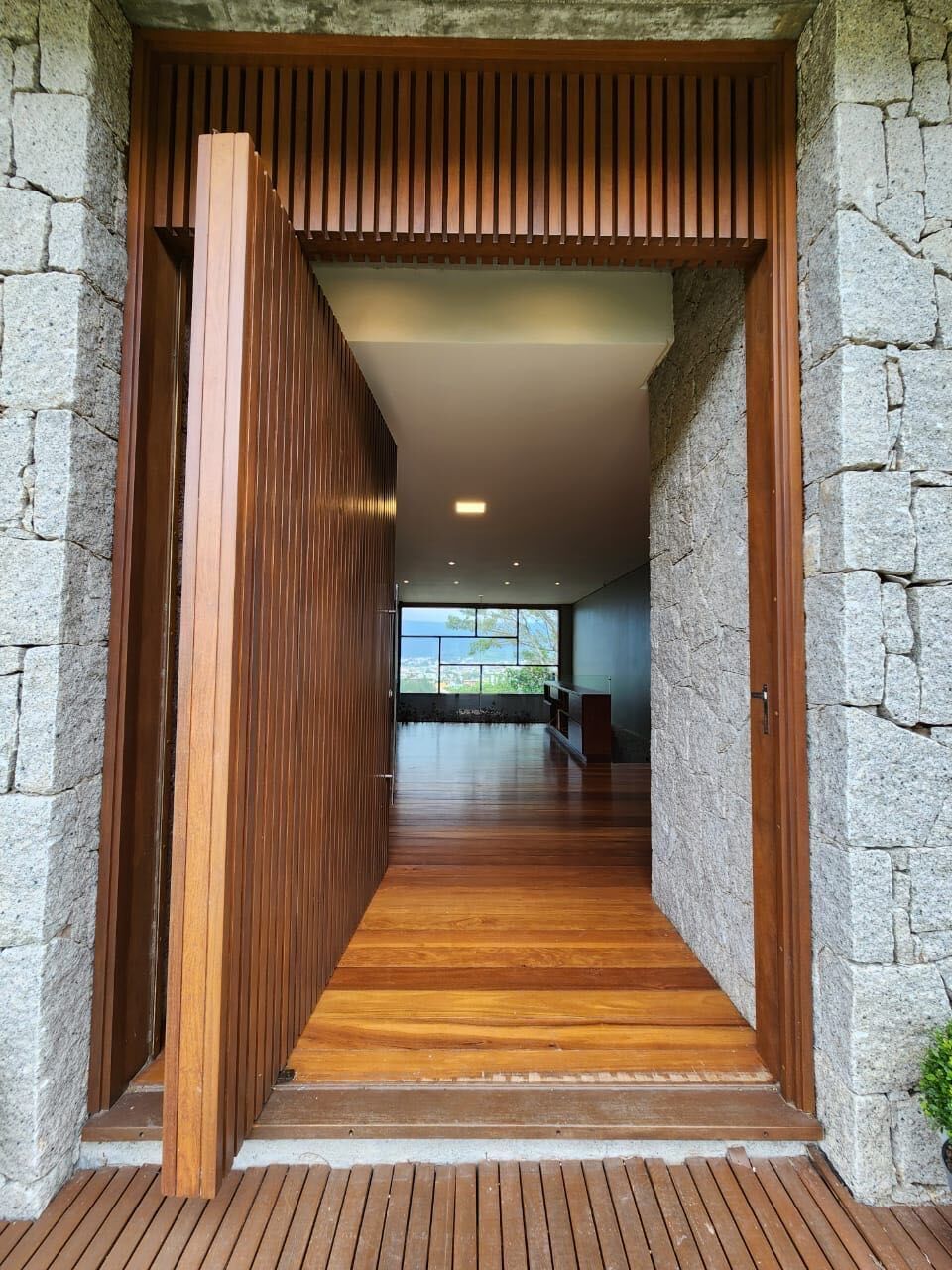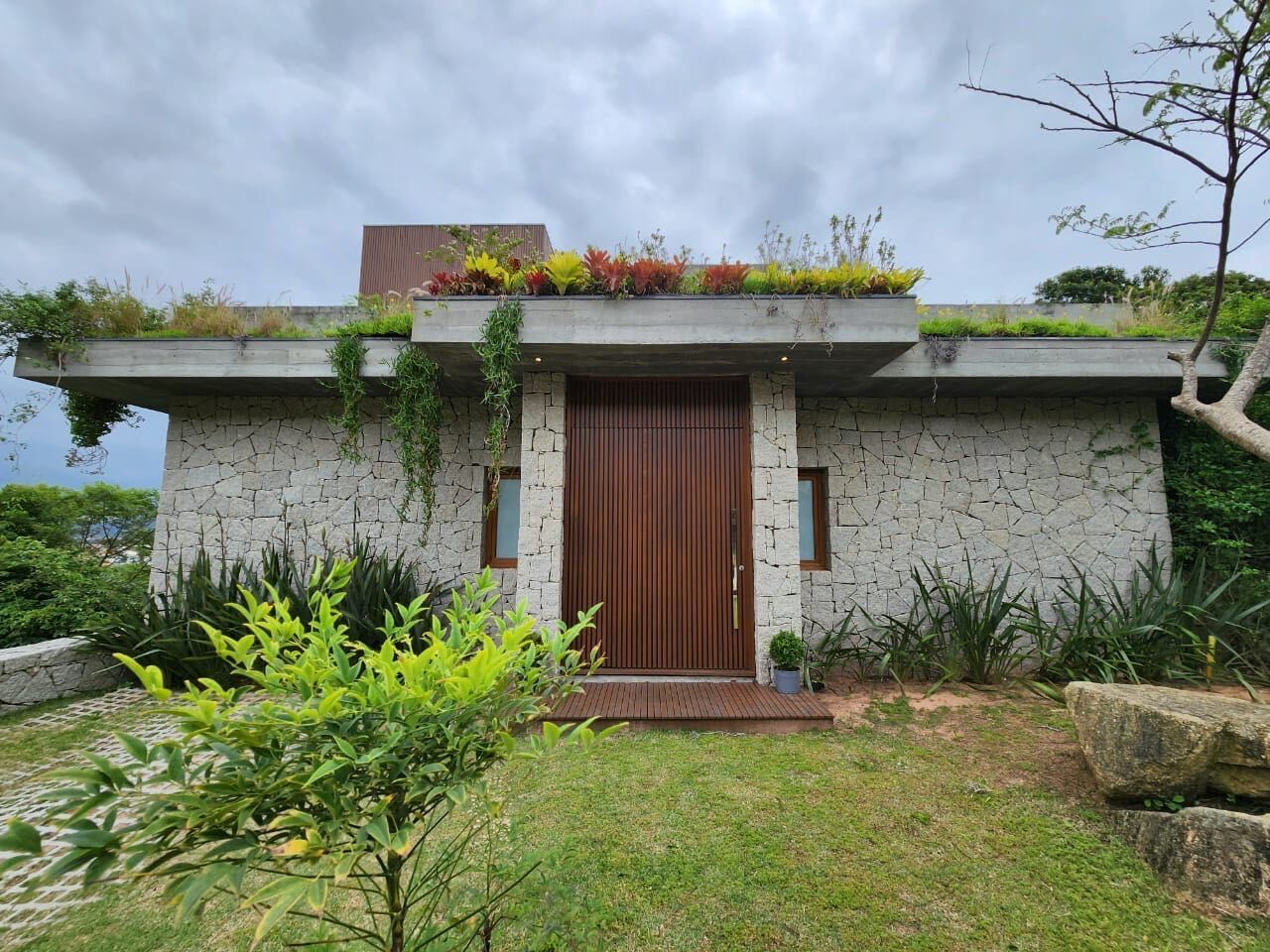 O imóvel possui um designer moderno e sofisticado, com madeira, pedras naturais e concreto.