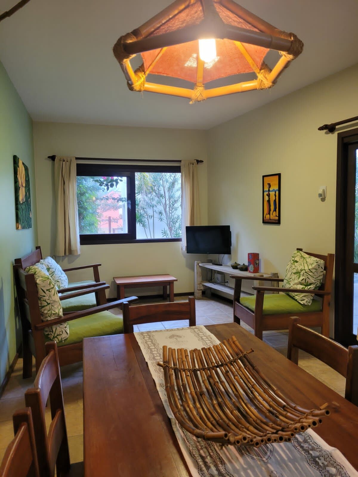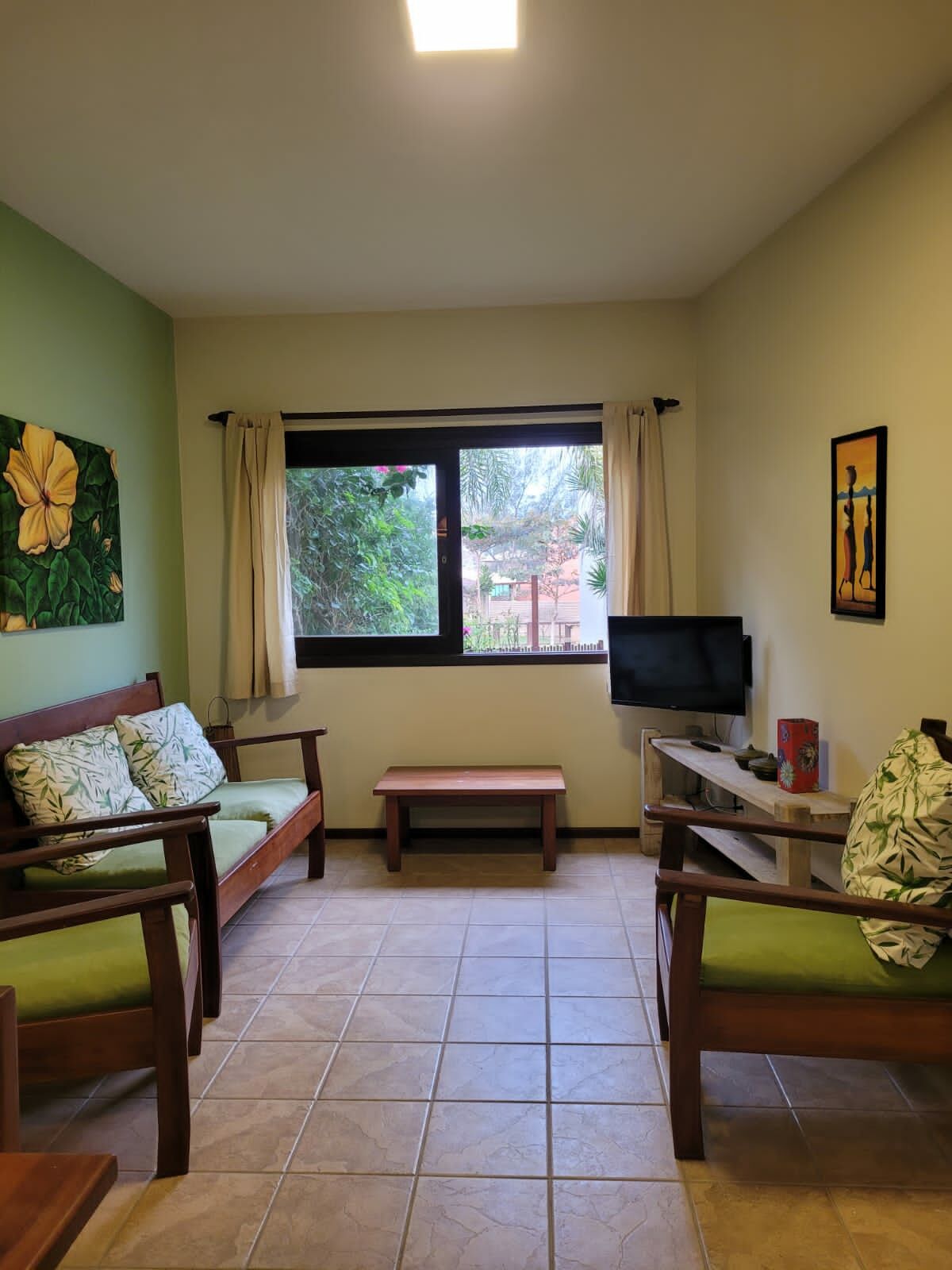 - sala de estar: um sofá, duas (02) poltronas, mesinha de centro, hack com TV e janela com cortina.