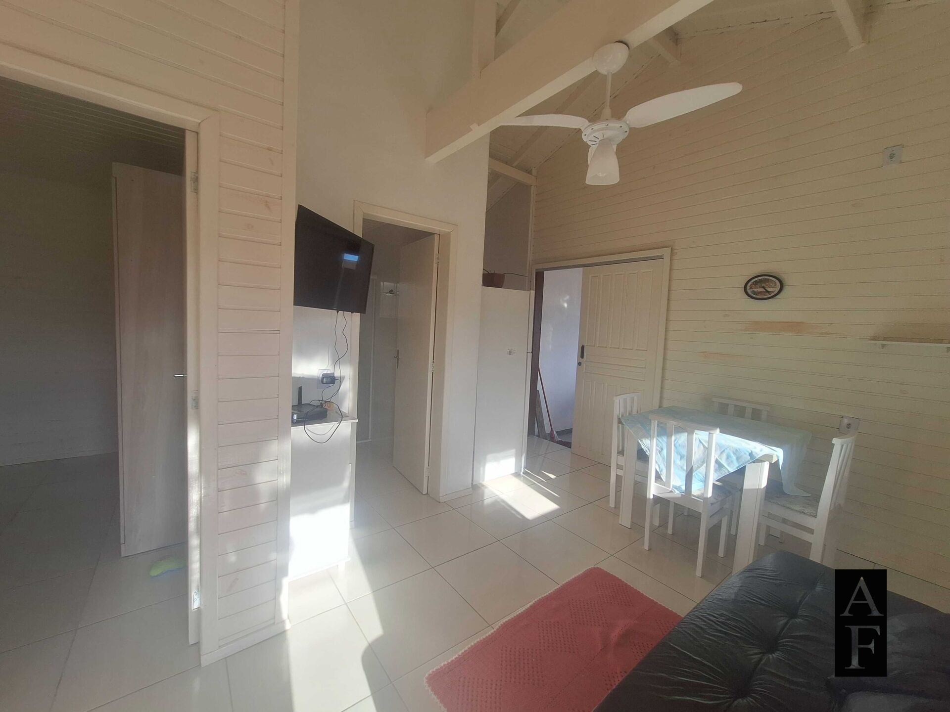 Parte interna: Sala de estar com cozinha conjugada, banheiro social e dois dormitórios.