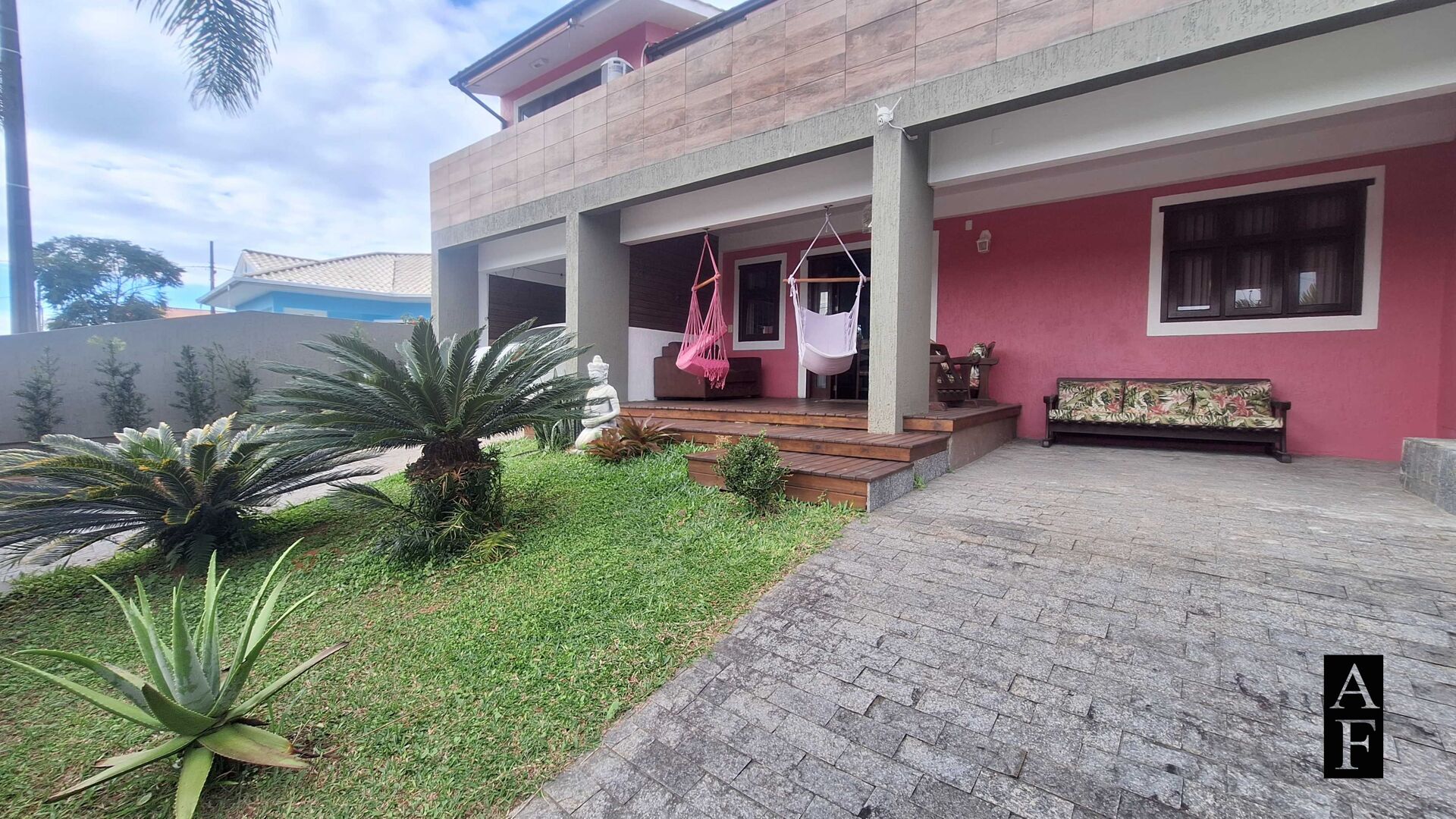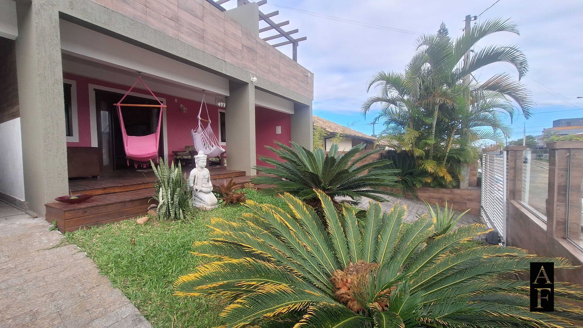 No exterior: Uma vaga de estacionamento e varanda na frente com deck. no fundo área gourmet com churrasqueira, piscina e amplo jardim.