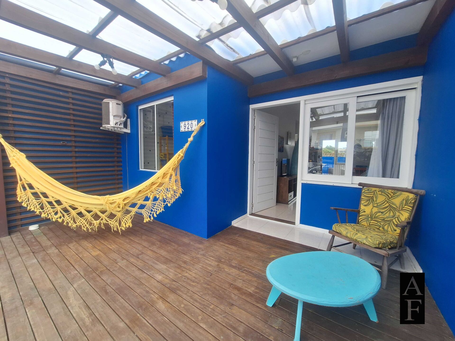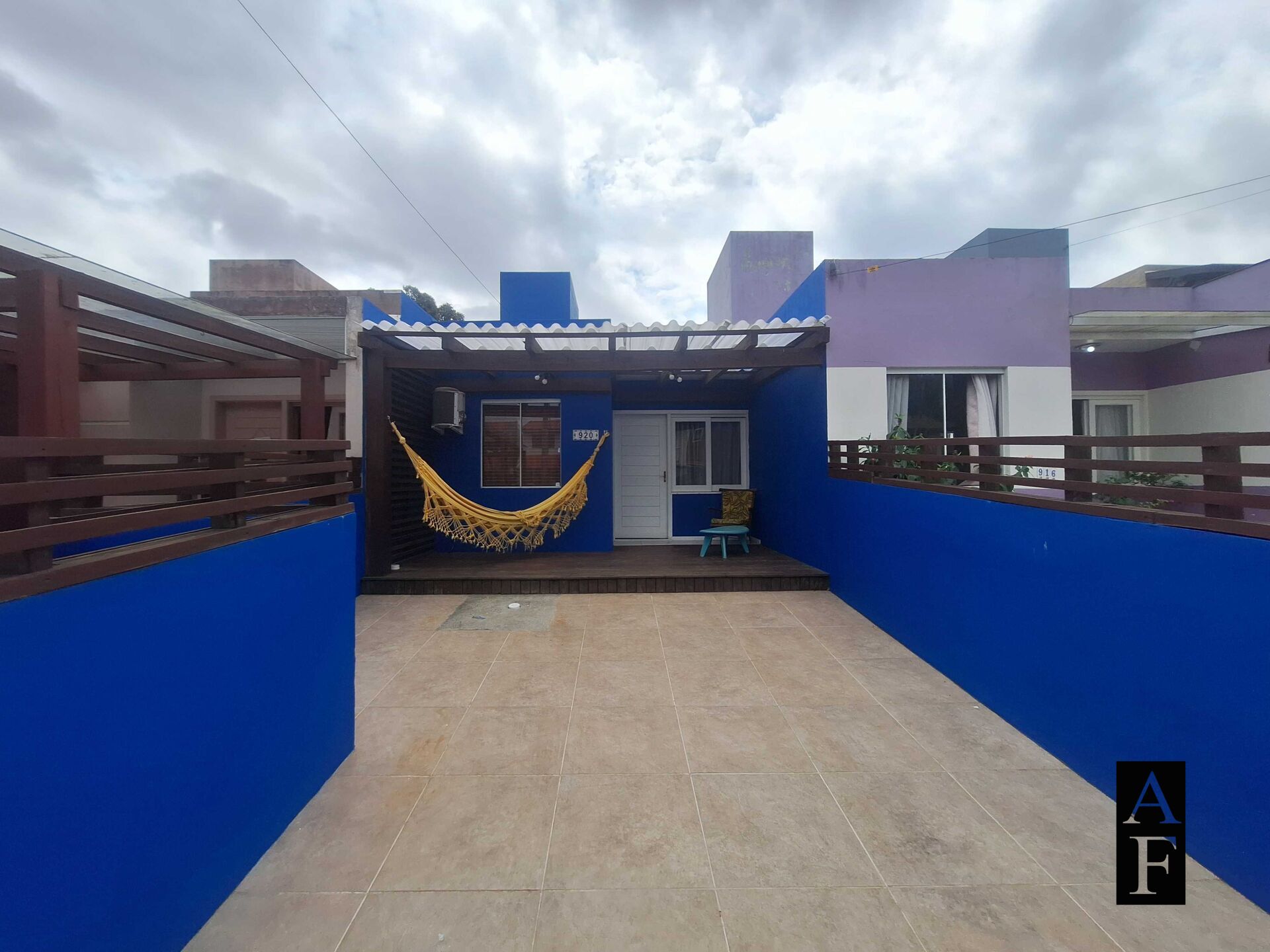 Patio na frente com vaga para carro e um deck com pergolado.
